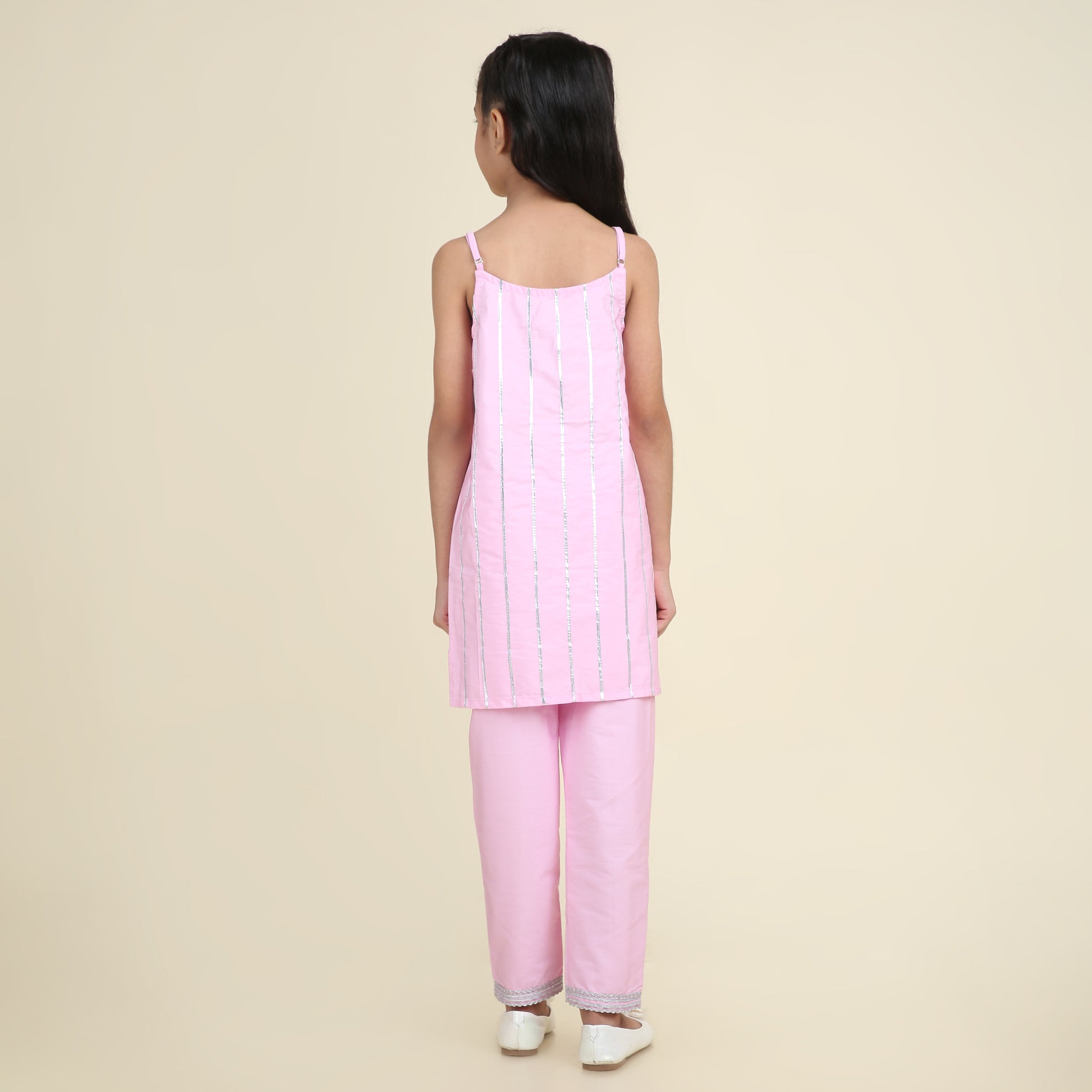 Soft as a whisper and sweet as a dream, Candy Cloud floats in with a touch of shimmer and endless grace. The blush pink cotton kurti glistens with fine silver lace detailing, paired with smart-fit pants featuring lace at the hem. A lightweight dupatta completes this pastel-perfect ensemble that feels like wearing a soft cloud kissed by sunshine.