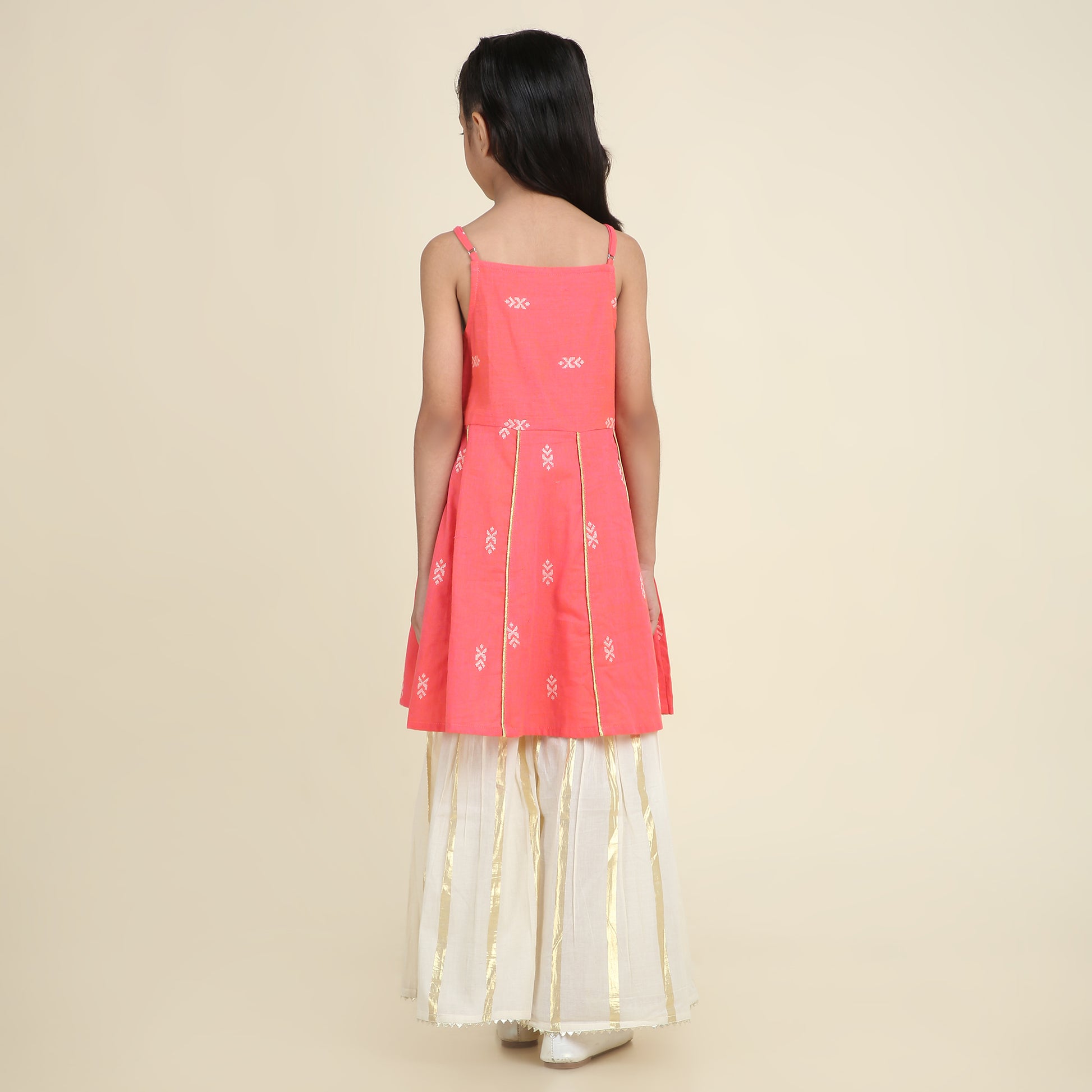 Radiant as a coral sunrise, Coral Glow is a poetic blend of festive sparkle and fairy-light grace. The pure handloom cotton kurti gleams with golden weave accents and adjustable straps for a perfect fit. Paired with an ivory sharara adorned in self-woven golden stripes and a breezy dupatta with coral and zari borders, this showstopper brings the magic of celebrations alive in every twirl.