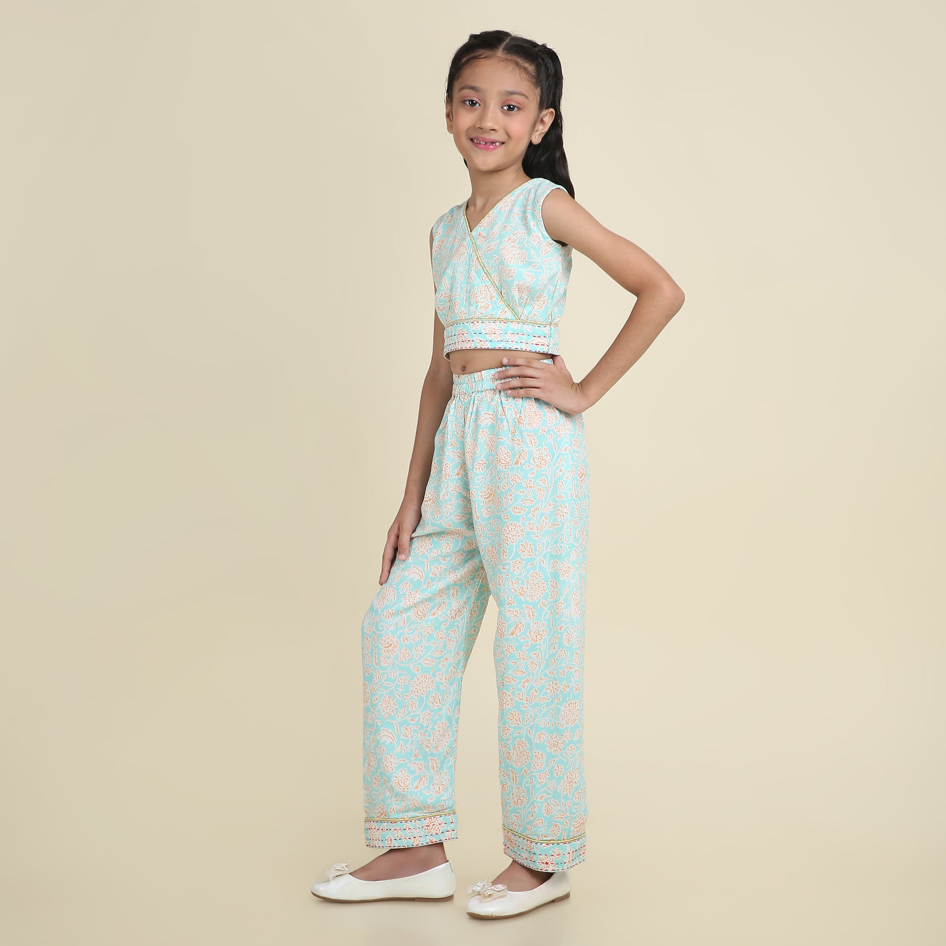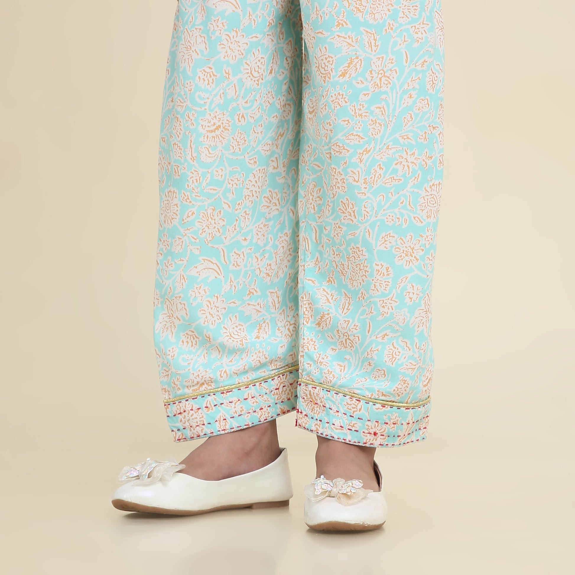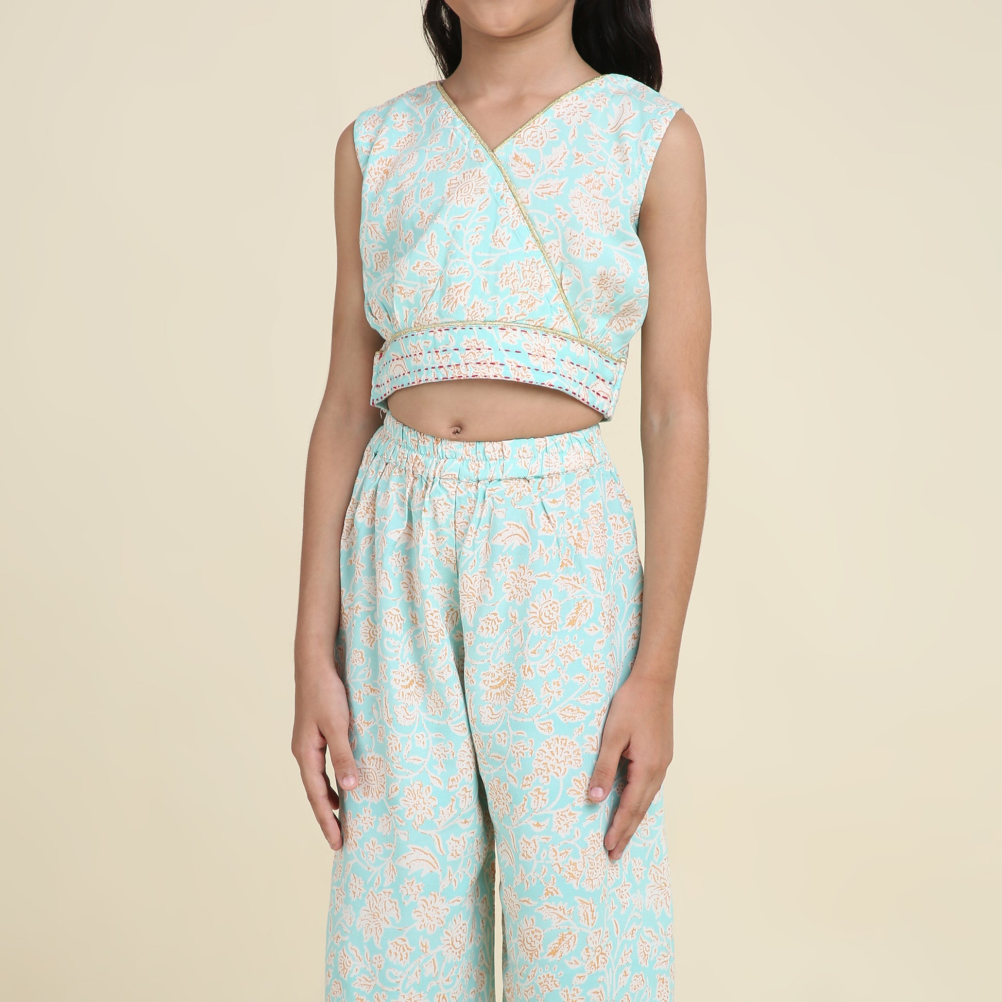 A charming co-ord set in soft turquoise viscose fabric, beautifully adorned with intricate floral prints. The crop top is enhanced with delicate red Kantha hand embroidery and a touch of golden piping, adding a traditional yet playful flair. Paired with comfy elasticated pants with coordinated detailing.