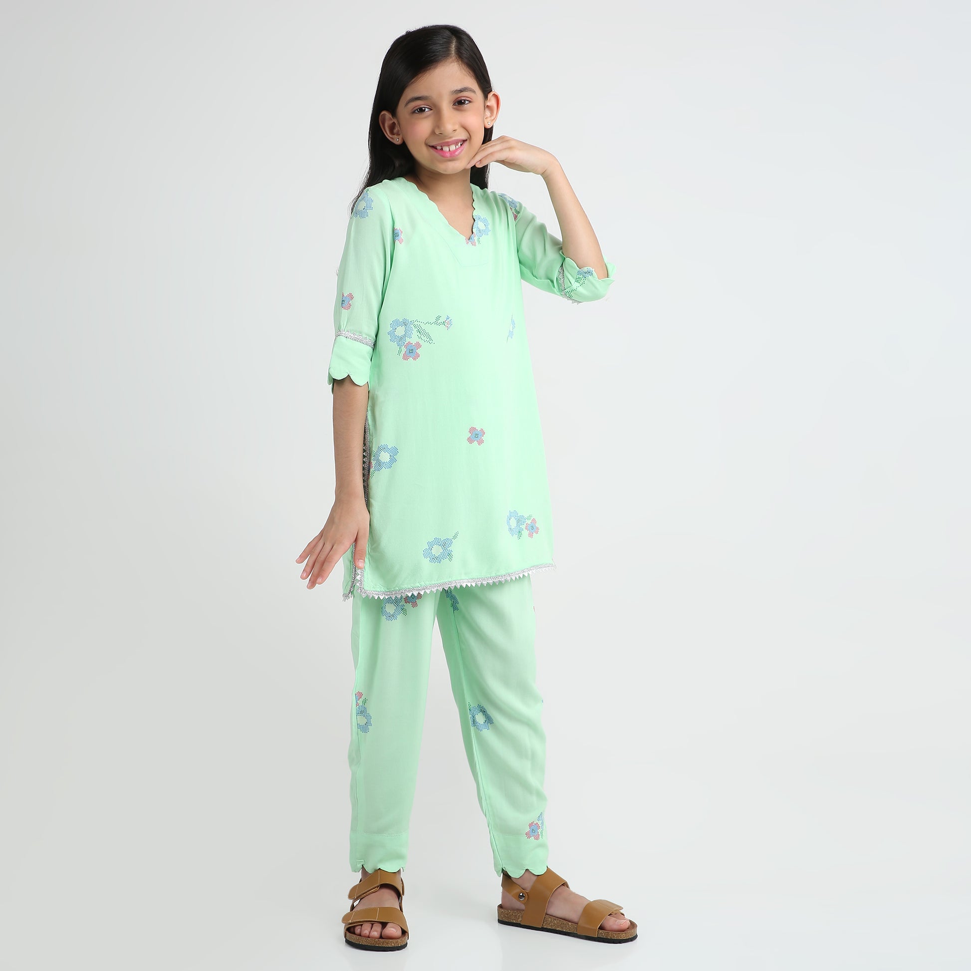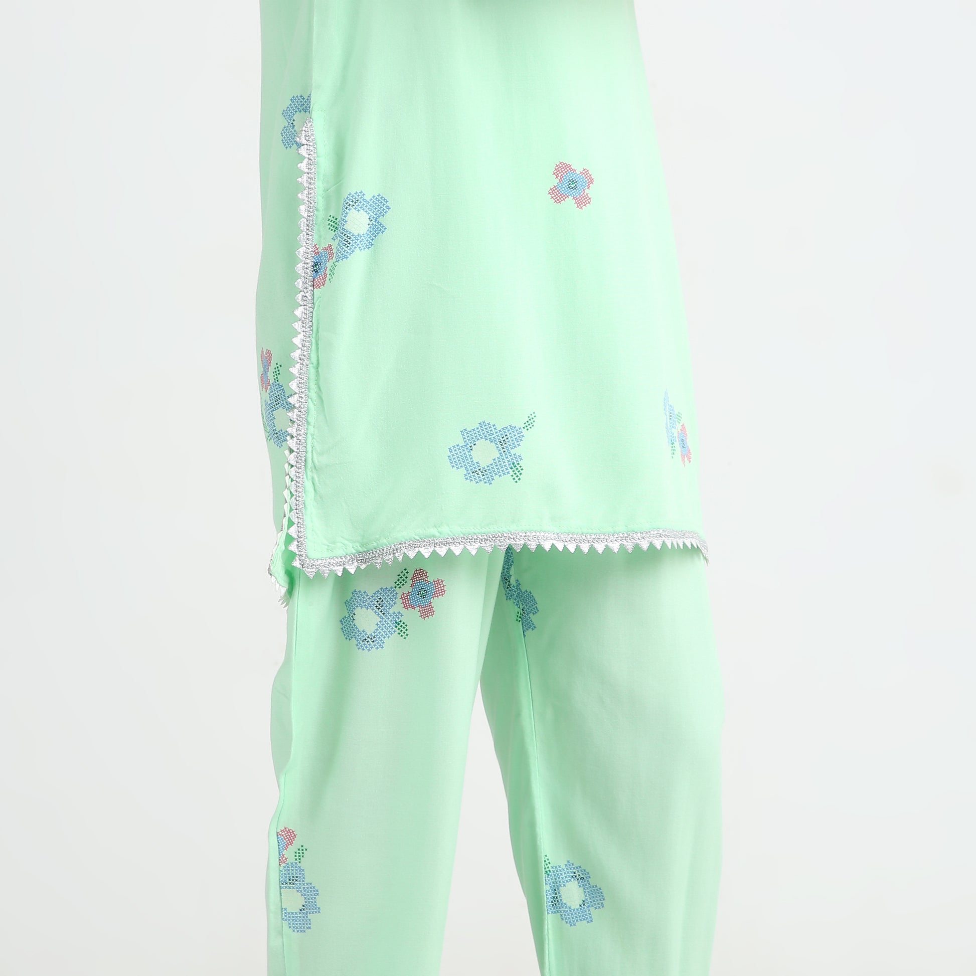 An elegant and refreshing kurti set made from 100% viscose fabric, designed for all-day comfort with a touch of festive flair. The kurti features scalloped finishing on the neckline and sleeves, while the pants mirror the same detailing at the hem. A fine zigzag silver lace runs along the edges of the kurti, adding subtle sparkle to this minty ensemble.